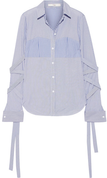 How cute is this tie up sleeve stripe button down?! I am obsessed with the sleeves. I have a number of stripe button downs in my closet but when I saw this Tibi one on Rent the Runway I had to rent it with my Unlimited subscription. I really like how the blouse has to different stripes one narrow and the other one thicker. Details like that make this top so unique. Now can I get a drum roll please...these jeans are the first pair that I had pre-pregnancy that I can zip up! You won't be seeing me wear them with a fitted top yet. ... Read more...
